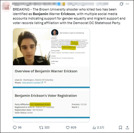 有美国网民查询其资料后发现,埃里克森的多个社交媒体账户显示他支持性别平等和移民援助。此外,他的选民记录显示他隶属于华盛顿特区建州绿党(DCStatehoodGreenParty)。该网民称建州绿党是极左翼美国绿党的下属分支,并在巴以问题上极度支持巴勒斯坦权利。